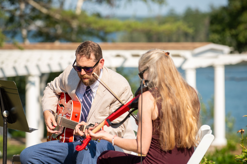 • But there’s more! Our frontman, Sam Pfeifle, is a licensed officiant in Maine and New Hampshire, and he and Heather Kahill, our fiddle player and second violin in the Bangor Symphony Orchestra, have put together a duo solution — hollow-body electric and electric violin — that makes for an elegant and captivating processional and recessional solution. This is what you want to walk down the aisle to! Once you’re at the front, Sam is a practiced officiant who will work with you to make sure the ceremony is well-planned, memorable, and meaningful for everyone involved. Let’s talk!